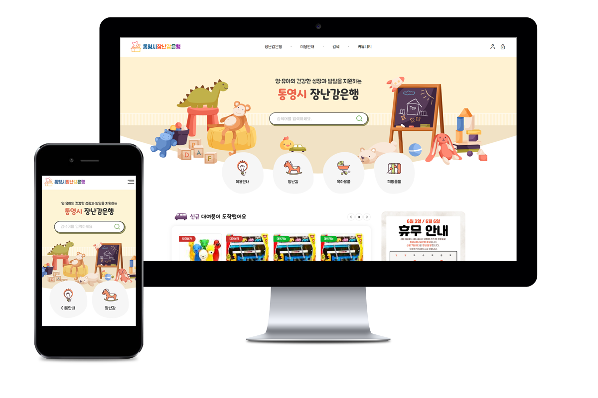 통영시 장난감은행 홈페이지이기에 유아나 보호자 분들이 주 방문자들임을 감안하여 전체적인 디자인을 귀여운 인상과 포근한 느낌을 주려고 노력하였습니다. 반응형 홈페이지이기에 상단 드롭바 메뉴 형식을 채택하여 직관적인 메뉴 선택이 되게 하였습니다. 방문자들에게 심플한 디자인을 제공하여 유저 인터페이스 편의성을 상승시켰습니다.