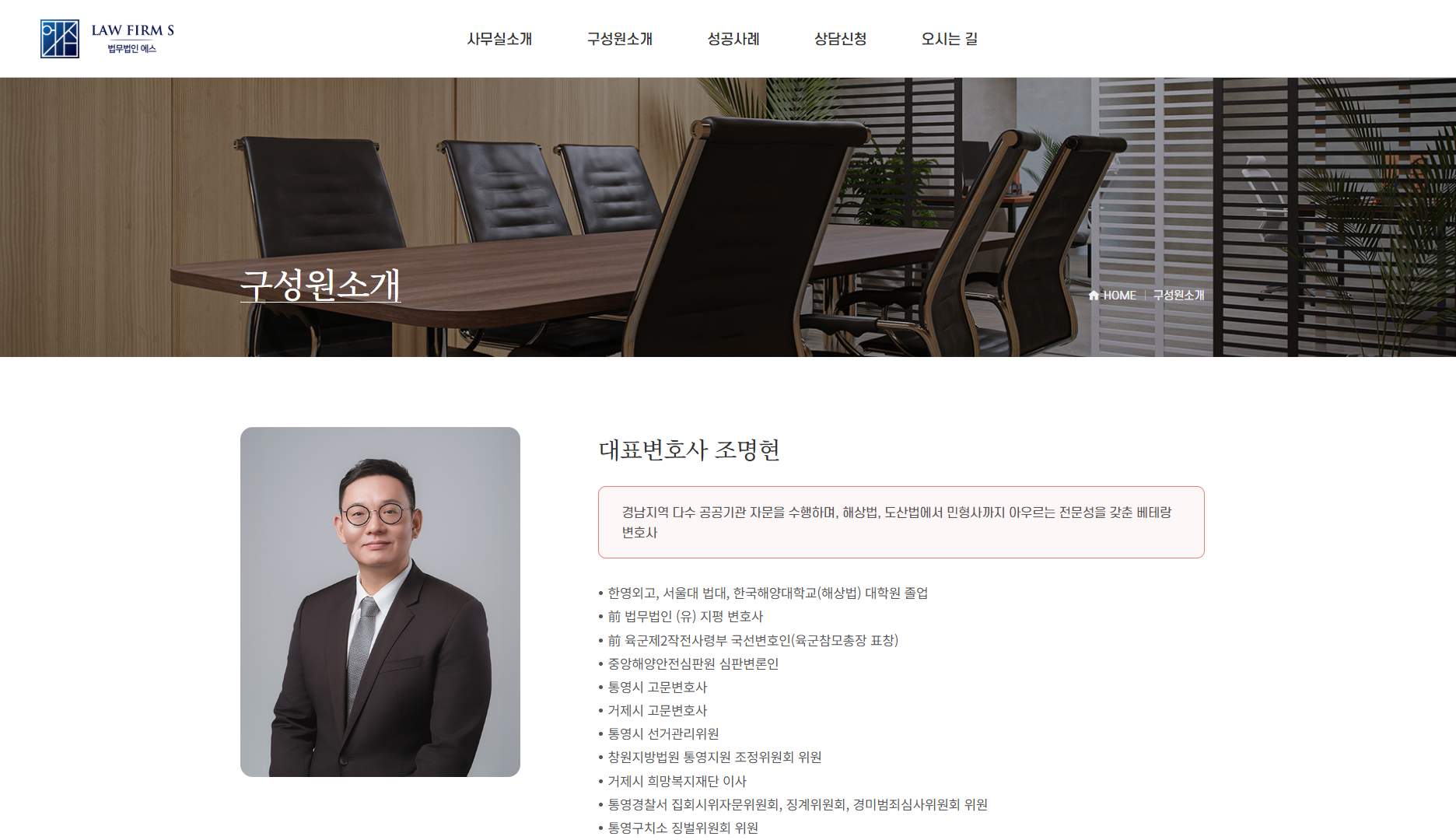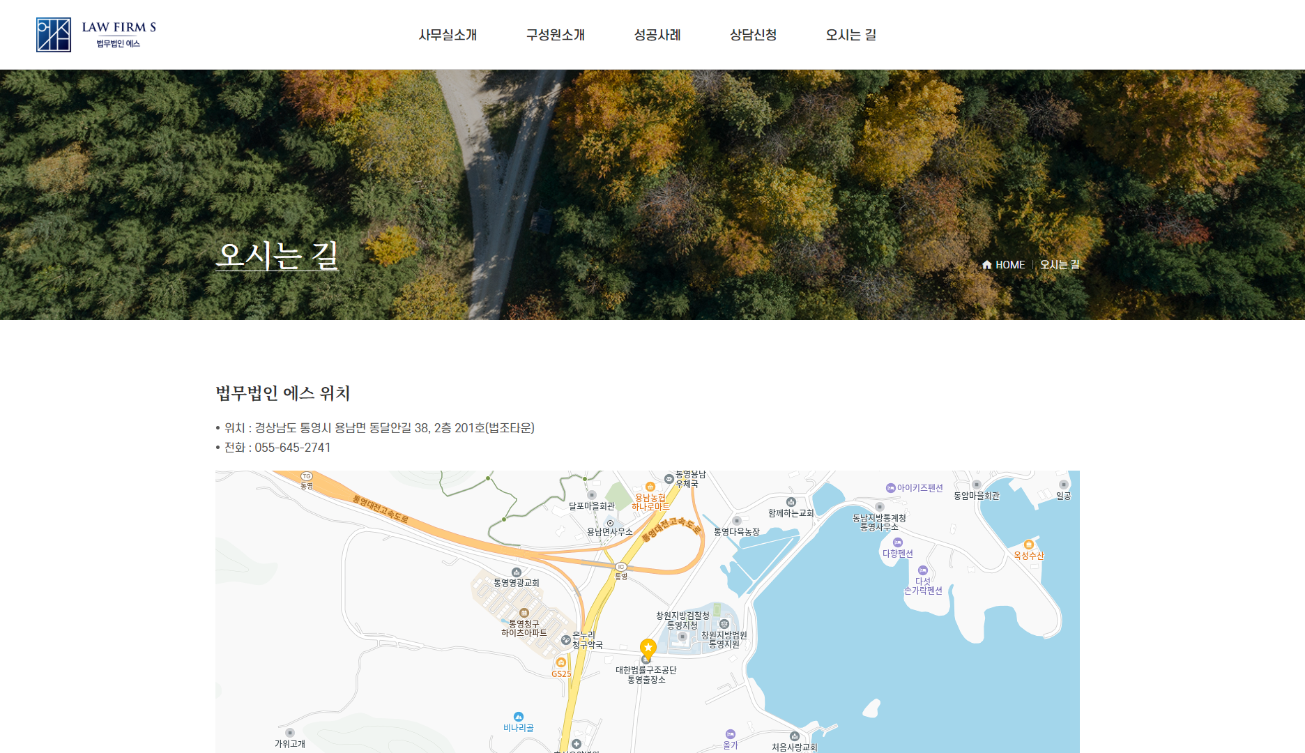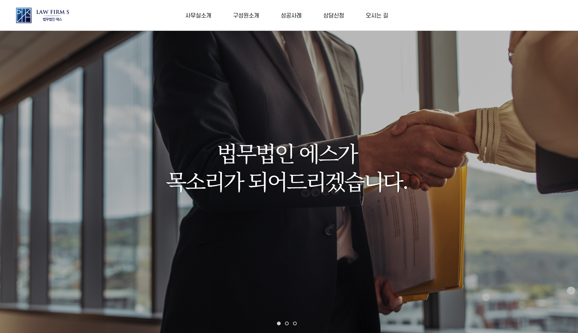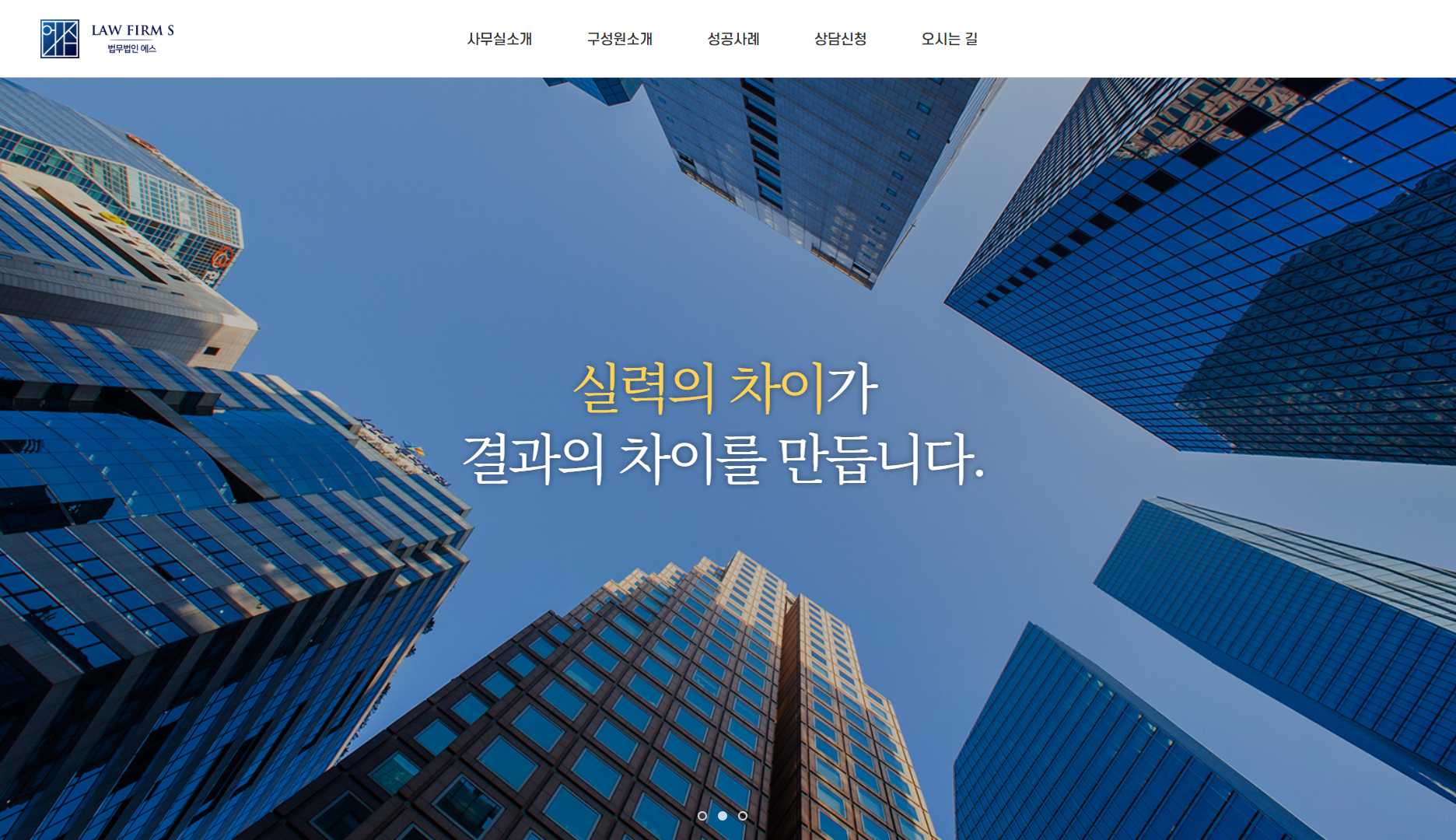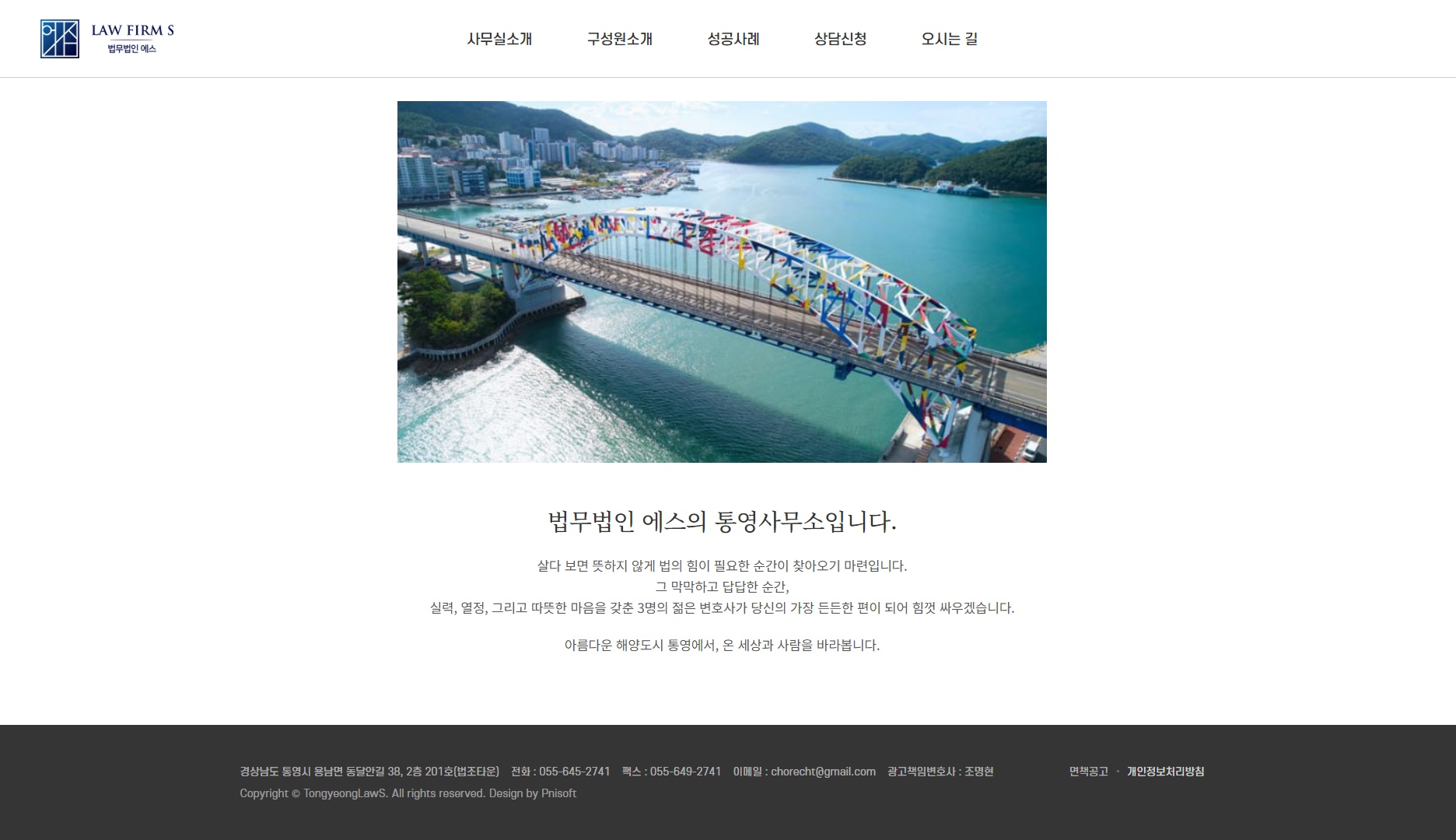 법무법인 에스의 통영사무소 홈페이지입니다. 법무법인이기에 방문자에게 강한 신뢰성을 주기 위해 짙은 남색과 갈색, 다크 그레이를 메인 칼러로 디자인했습니다. 정보 제공의 직관성을 주기 위해 상단 고정 드롭바 메뉴 형식을 채택했습니다.