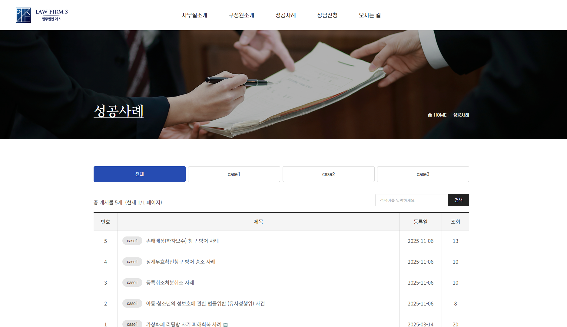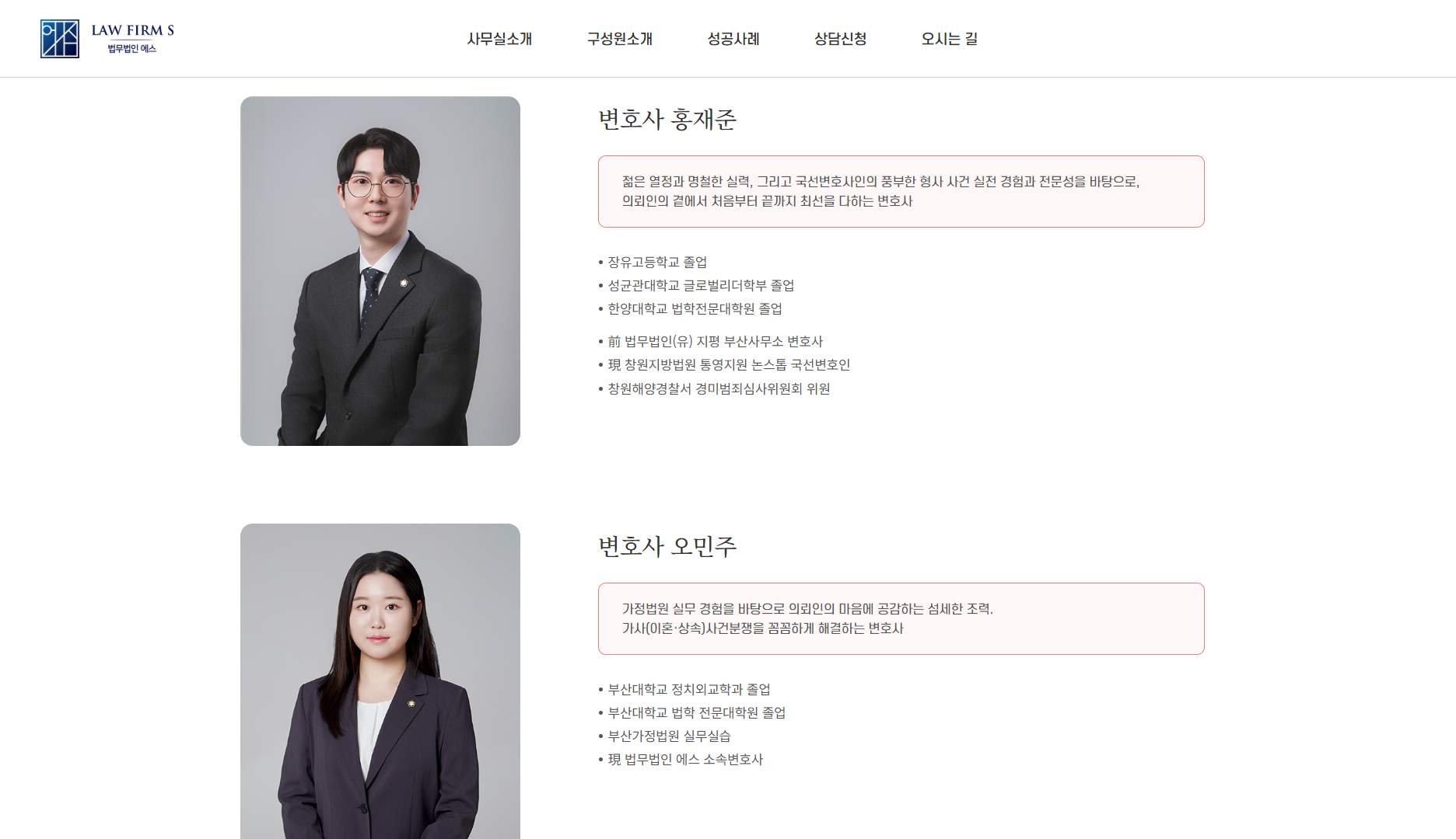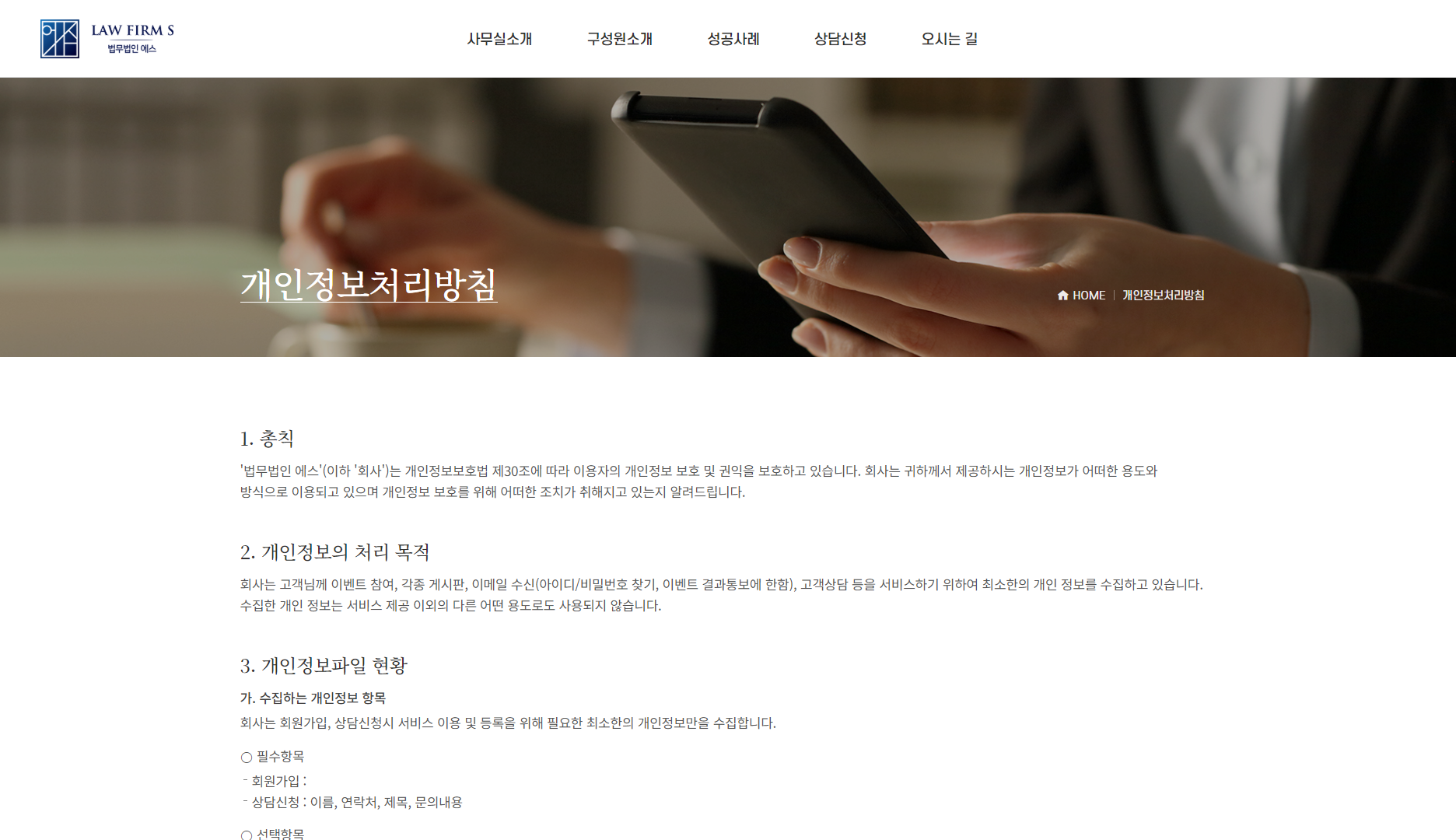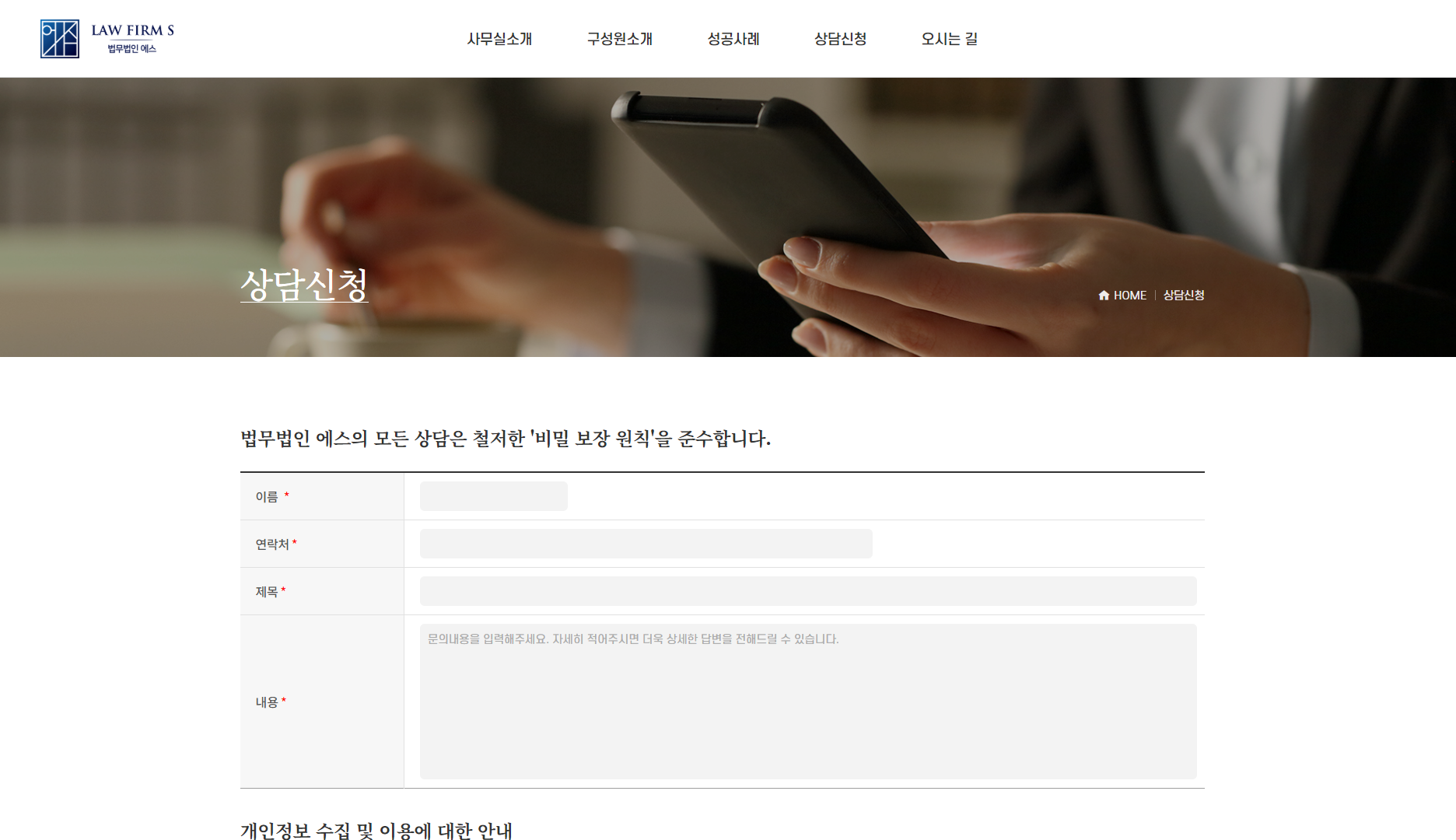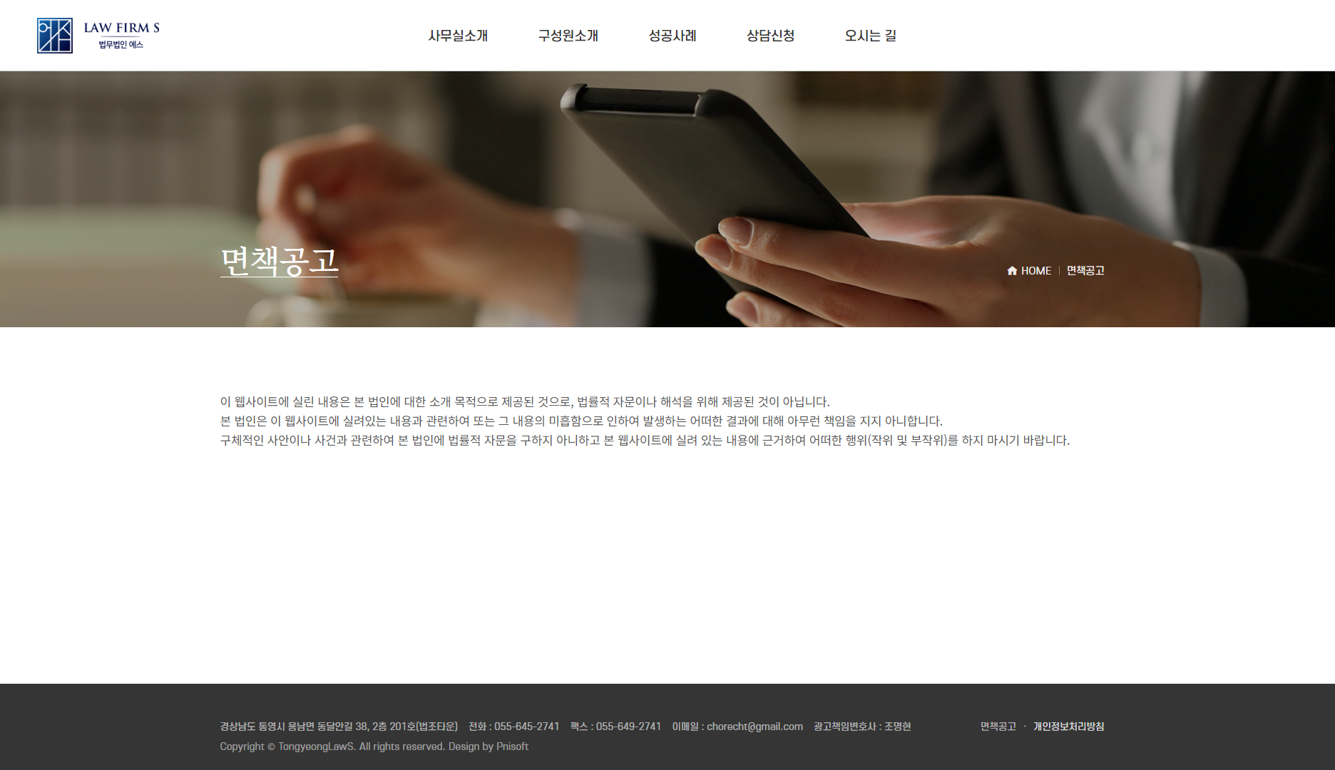 법무법인 에스의 통영사무소 홈페이지입니다. 법무법인이기에 방문자에게 강한 신뢰성을 주기 위해 짙은 남색과 갈색, 다크 그레이를 메인 칼러로 디자인했습니다. 정보 제공의 직관성을 주기 위해 상단 고정 드롭바 메뉴 형식을 채택했습니다.